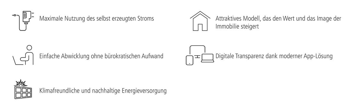 Machen Sie Ihre Wohnanlage fit für die Zukunft: Nutzen Sie die Vorteile einer hohen Eigenverbrauchsquote, steigern Sie Ihre Autarkie und sparen Sie bis zu 6 t CO₂ pro Jahr.